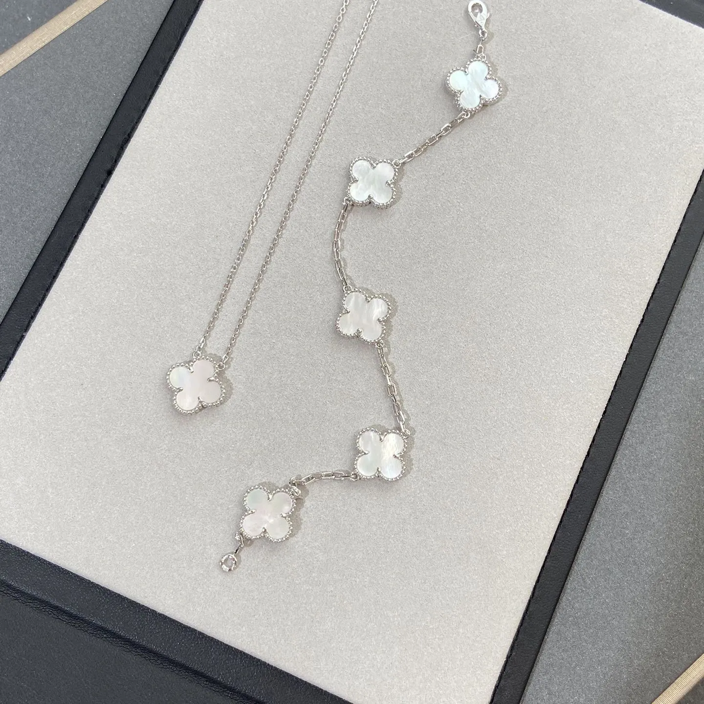 Graceful clover silhouettes in soft light — necklaces, bracelets, and sets for everyday elegance.